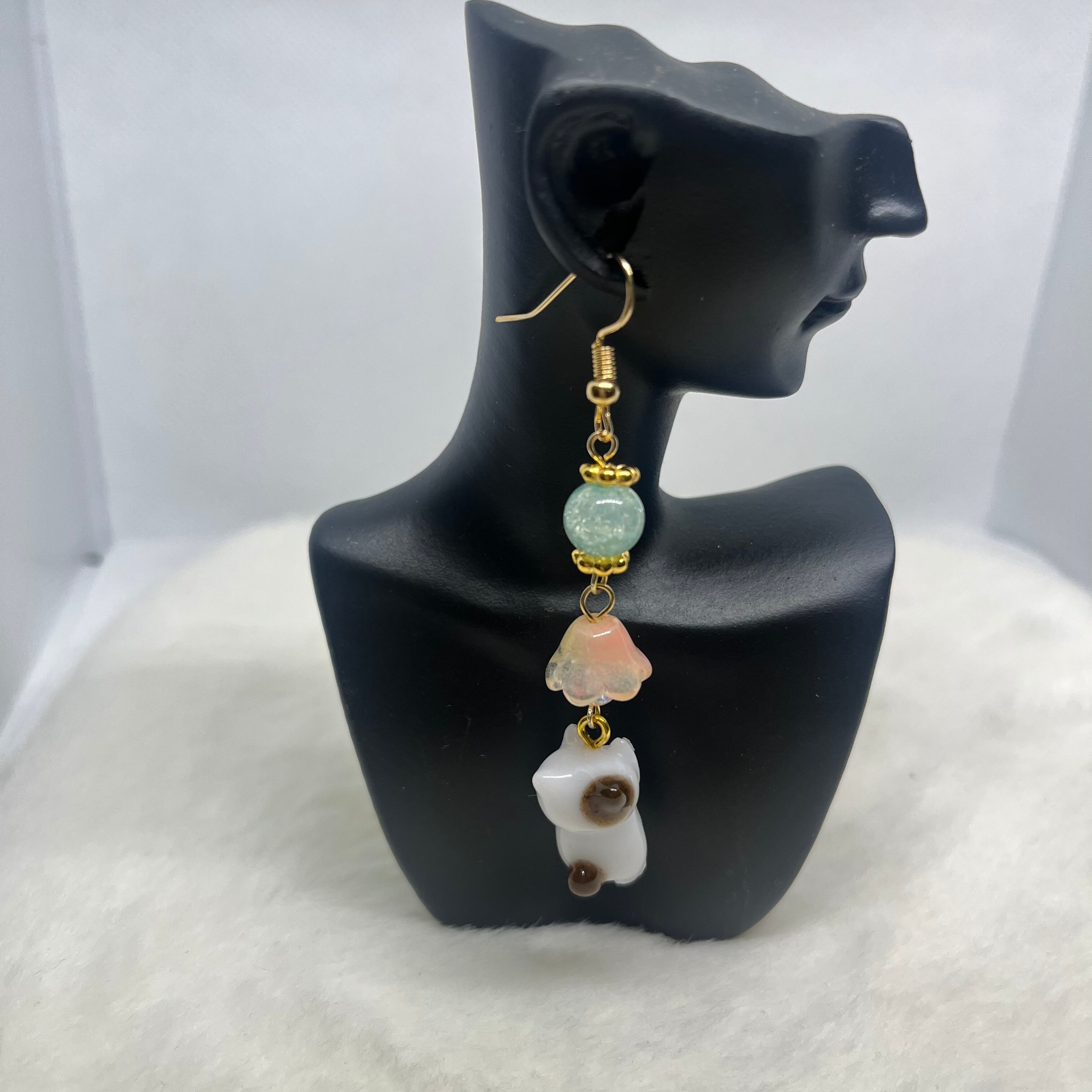 かわいらしい猫とお花のモチーフが描かれたゆらゆらピアス/イヤリングです。猫好きの方にはたまらないアクセサリーですよね。猫とお花が揺れるたびに、まるで風に揺れる花畑の中にいるような心地よさを感じます。